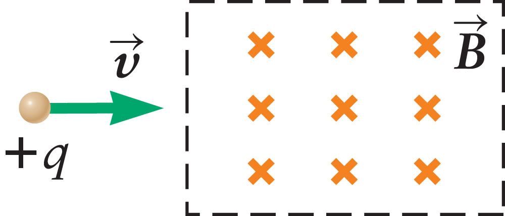 The particle in the figure has a positive charge, and its initial velocity is to the right when it enters a region where B is directed into the plane of the drawing. In which direction will the particle be deflected?