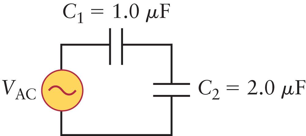 Two capacitors are connected to an AC source as shown in the figure. Assume VAC = Vmax sin(2 f t), with Vmax = 20 V and f = 2998 Hz